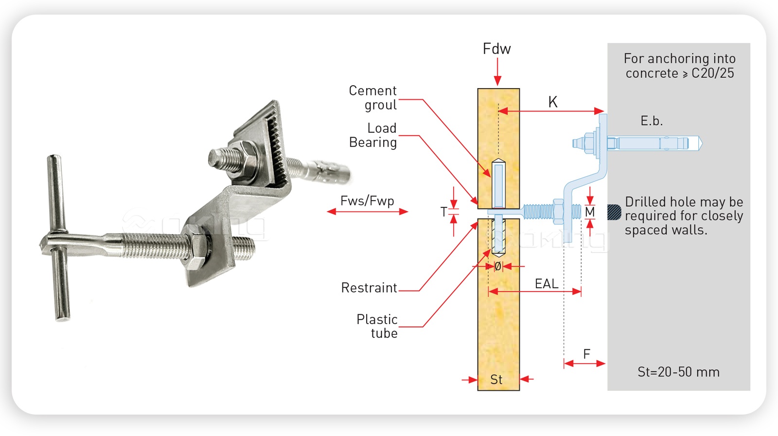 | K (mm) | K - (mm) | K (mm) | Fdw (N) | F (mm) | Fwp (N) | Fws (N) | Eb (mm) | ф (mm) | M (mm) | T (mm) | EAL (mm) | |
